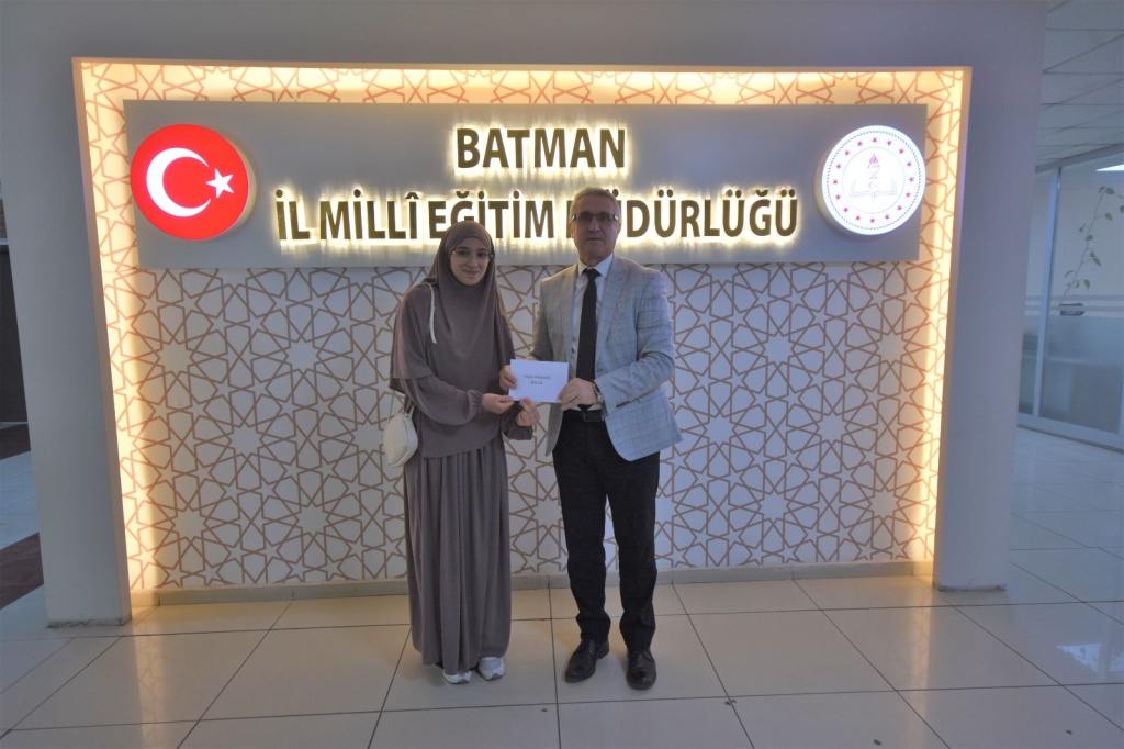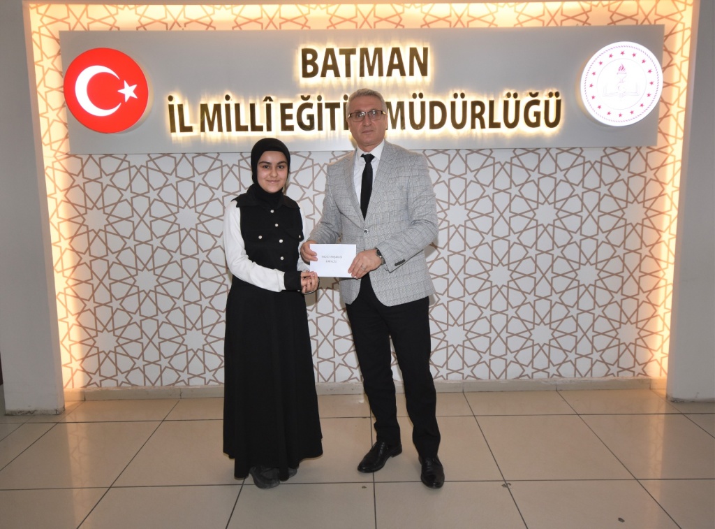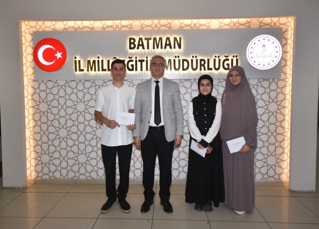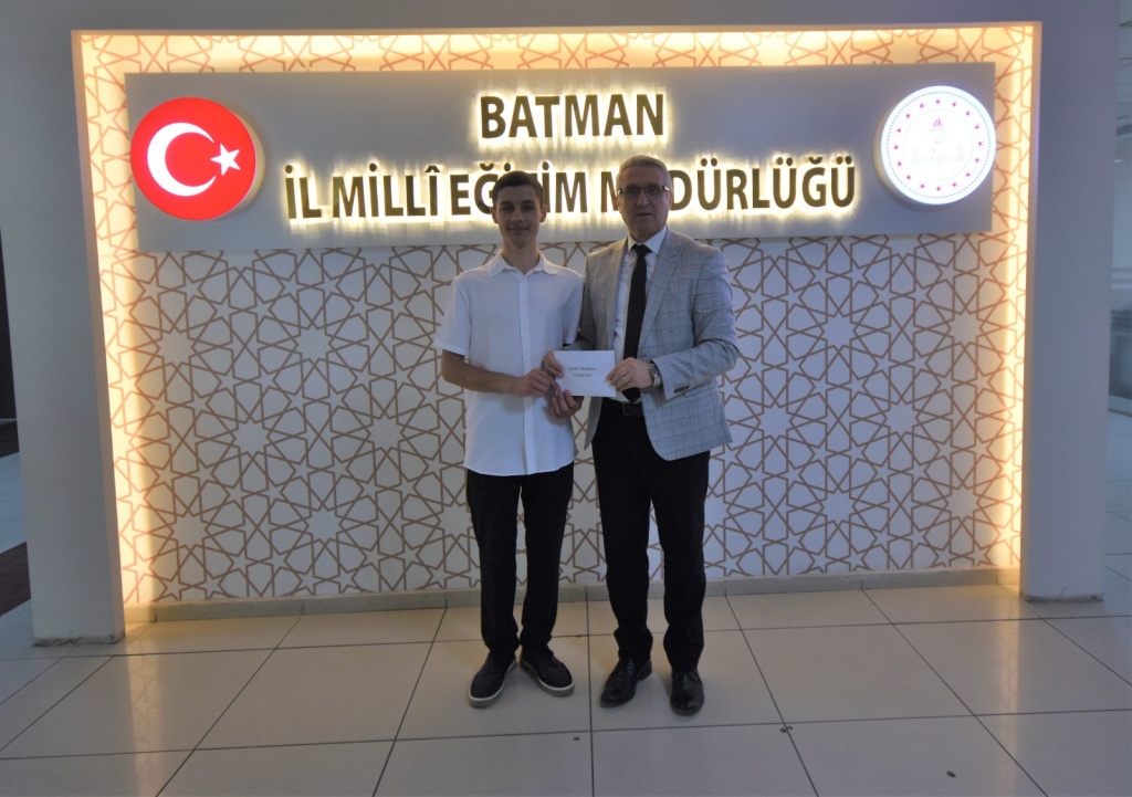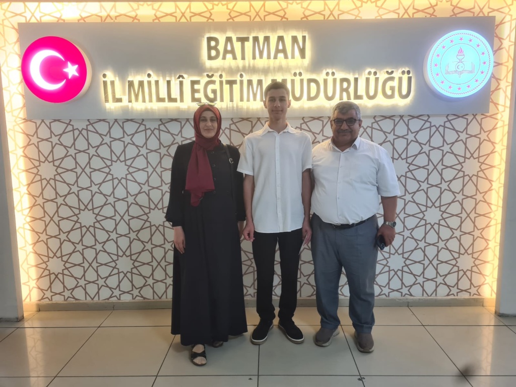 Okulumuz öğrencilerinden Muhammed Ali Aslan, gösterdiği başarıyla il üçüncüsü olarak bizleri gururlandırdı. Dereceye giren öğrenciler, Batman İl Millî Eğitim Müdürü Sayın Yaşar Ciğer tarafından kabul edildi. Sayın Ciğer, öğrencilerle yakından ilgilenerek başarılarından dolayı tebrik etti, eğitim hayatlarında daima başarılı olmalarını temenni etti.